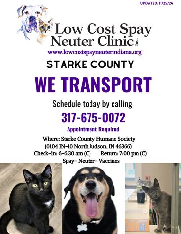 We are a transport location for the Low Cost Spay Neuter Clinic.